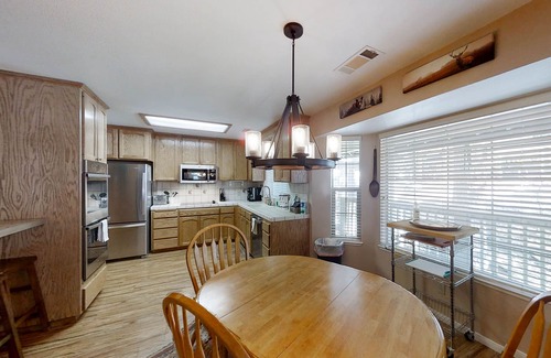 A well equipped kitchen with eating area is available for the family chef. Waffle maker, griddle, crock pot and coffee grinder are only some of the premium amenities available. A large living room area offers a great place to gather with family and friends and enjoy your favorite movie on the 55 inch 4K Smart TV. WiFi High-speed internet is also available throughout the home. Next to the living room area is a separate dining room.