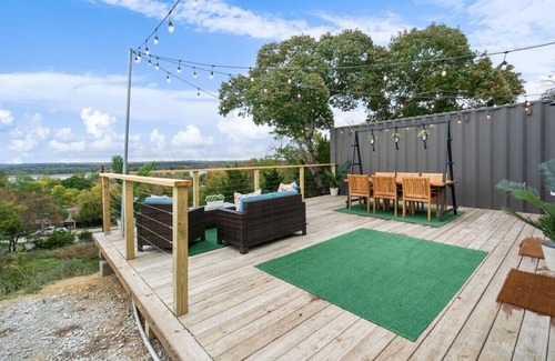 Welcome to our unique container home nestled in a serene setting, offering breathtaking views of Lake Weatherford. Perfectly positioned to provide a tranquil escape, this one-of-a-kind accommodation is designed to immerse you in the beauty of nature while enjoying the comforts of modern living. The open-plan layout seamlessly combines cozy living areas, a fully equipped kitchen, and a dining space, all adorned with large windows that frame stunning views of the waters below.