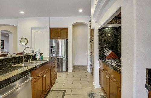 This vacation home opens up to a spacious living room with a large kitchen. There is plenty of room in the living room to lounge in front of a 60-inch Samsung Smart television and natural gas Fireplace in comfort with a remote-controlled ceiling fan. The casual dining area features a dining table with seating for eight. The fully-equipped kitchen features stunning stainless steel appliances such as a Samsung french door refrigerator with a water and ice dispenser and offers everything one would need to create their perfect meal including granite countertops and bar height dining with seating for four. No spices, condiments, or oils are provided. Getaway to the Gameroom and challenge your friends and family to a game of pool that features a remote-controlled ceiling fan and seating for four.