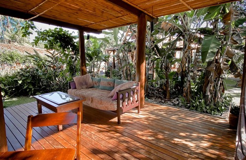 Caring for the environment is part of our daily routine, and we invite guests to do the same, recycling their trash and disposing of food scraps in the compost and worm bins, and taking care to reduce water use and electricity. We ask that you use only biodegradable soaps and conditioners, as well as our natural cleaning products whenever possible. The homes were built using ecological materials like bamboo and recycled wood, as well as principles for conserving energy use and reducing wastes. We have a banana sewage treatment system, a green roof, solar panels for electricity, and solar hot water system. We occasionally promote workshops throughout the year in the areas of well-being, healthy cooking, and permaculture. If you are interested in these subjects, please feel free to ask for more information.