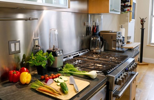 You’ll enter into a spacious living room with an open kitchen, 10-foot ceilings and oversized windows. The kitchen is equipped with stainless steel appliances and Italian stone counter-tops. The first floor also has a full bathroom with a shower stall. There is a large couch that can be used as an extra bed need be.