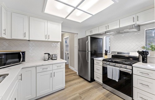The kitchen comes with all your standard cooking equipment, dishware, silverware (bowls, plates, cups, etc.), a stainless steel refrigerator, microwave, stove, oven, toaster, rice cooker, and Keurig coffee machine. Cook with any of the complimentary spices to enhance your meals, and don't forget to craft up some delicious drinks for the group with the cocktail kit!