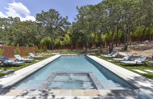 With a stunning outdoor space encircled by old-growth native oaks, the pool and hot tub make a natural gathering place for a tenant to enjoy the beautiful surroundings. Luxurious cabana furniture, outdoor kitchen, dining area and fire pit offer ambiance and options for outdoor entertainment.