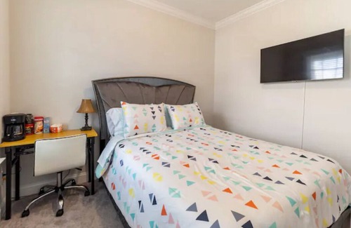Our rental comes with 1 Queen bedroom and a shared bathroom, free Wi-Fi, mini Fridge, Smart TV, Microwave, Coffee Maker, Dedicated Workspace, self-check-in, and privacy room lock.