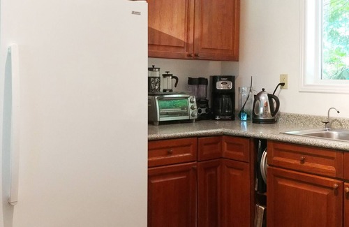 The fully equipped kitchen features beautiful stone tiles and oak cabinets and includes anything you may need such as cutlery, dishes, pots, baking pans, cookbooks, and full-size appliances such as a fridge/freezer, stove/oven, built-in dishwasher, coffee maker, toaster oven, and microwave.