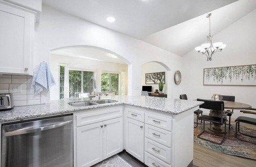 This spacious home has a versatile living space that is great for groups of all sizes. The inside of the home is clean and modern with vaulted ceilings and open space. In the backyard, there are towering trees and a lush garden. The home offers the cleanliness and amenities of a hotel combined with the space and privacy of your personal residence.