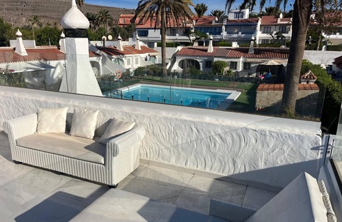 Fully-equipped renovated bungalow with private sun terrace and shared swimming pool, located at the private yacht club Pasito Blanco, at walking distance from the Pasito Blanco beach, and with all services available for a wonderful holiday in the south coast of Gran Canaria.Located on one of the best yacht clubs of the island, with nice parks and walking areas, access to its beach and to its private sea club with restaurant, chill out and swimming area, and right next to the wonderful Meloneras Golf Course. It allows a relaxed stay on the south of the island, very close from its main touristic attractions like Meloneras Boulevard, but without the noise of its streets and commercial areas. It is perfect to spend a holiday enjoying sport activities such as golf, cycling, fishing or sailing, or just to relax on its swimming pool with wonderful sea views.The house is distributed in one single floor at street level, and consists of a wide living room with smart tv, dining area and fully-equipped independent kitchen, a private terrace, a private sun terrace with sea views on the rooftop, two bedrooms with double beds, and two full bathrooms with walk-in shower. Guests also have access to a large common pool.There is free WIFI throughout the house. It has plenty of street parking area near the door of the house. The yacht club urbanisation is private, with continuous surveillance, supermarket, and restaurant. Access to the motorway is less than 1 km away and the airport is 30 minutes away.