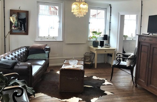 Die Wohnung wurde mit großer Liebe zum Detail mit viel Geschmack ausgestattet. In den alten, sehr hellen Räumen wurde ein schöner Holzdielenboden verlegt, alte Möbel und Bilder tragen zu einer ganz besonderen Atmosphäre bei. Die Küche ist modern und voll ausgestattet, ein gemütlicher Essplatz lädt dazu ein, schön zu frühstücken oder abends zu verweilen. Das Bad ist mir freistehender Badewanne und hübschen Details besonders außergewöhnlich. Die Wohnung bietet einen stimmungsvollen, gemütlichen Rahmen für einen ganz besonderen Aufenthalt zu zweit.
