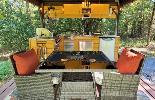 The camp is fully equipped with an American-made, heated canvas bell tent, a real queen-sized platform bed, and layers of comfortable bedding for a restful night`s sleep. Relax on the covered patio in rocking chairs or enjoy a meal at the outdoor kitchen and dining area. Don`t forget to take a swing or lounge in the 2-person hammock while gazing at the beautiful natural surroundings. And, of course, every campsite needs a fire-ring and propane grill for a classic outdoor dining experience.