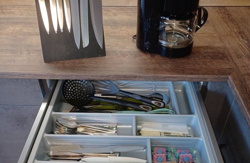 The kitchen is equipped with an oven, a stovetop, and a refrigerator, as well as a coffee maker, an electric kettle, and cookware. Other amenities include a living room, bike storage, heating, and change of towels on request.