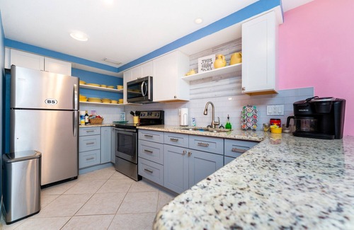 Flamingo's Nest is fully furnished with all you will need but your flip-flops. Fully updated kitchen with microwave, stove, refrigerator with ice maker. All small appliances including toaster, crock-pot, Keurig, twelve cup coffee pot and of course a blender. King size bed with eight foot closet, queen size sofa sleeper with upgraded mattress. Fully updated bathroom with shampoo, conditioner, body wash, and hair driers. Indoor full size washer and dryer. Dining seating for four. Outdoor patio with plenty of seating and of course your own individual gas grill