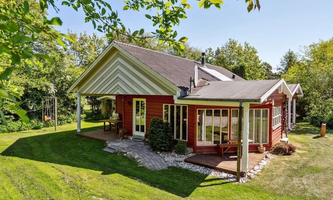 Single-family house, built in 2002. For shared use: garden. Private: natural state property 2'878 m2, garden (fenced). Outdoor shower, terrace (30 m2), barbecue, children's playground (slide, swing). In the house: trampoline, washing machine. Parking at the house. E-charging station. Grocery 7 km. Golf course 12 km. The owner does not accept any youth groups.