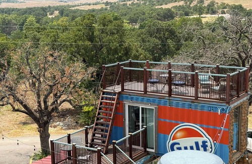 Full Throttle Garage - Tiny house w/ smart TV, WiFi, Walk-in shower. Kitchenette, large upper deck with mountain views. A few mins to Cobblestone row, shops, restaurants, Bath Lake swimming, and Wichita Mountains trails; 10 min to Fort Sill. Great for couples, solo stays, or graduation visits. Perfect auto-racing themed décor with access to shared gazebo + grill. Fun retreat at InnHabit, Medicine Park’s gathering place.