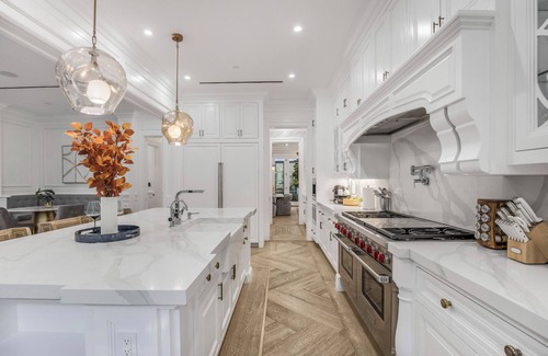 Upon entering, you’ll be greeted by wide plank wood floors that run throughout the expansive living areas. Expansive pocket doors connect these elegant indoor spaces to the serene backyard, allowing for a seamless transition between indoor and outdoor living. The backyard is a true haven, featuring a Bali-inspired pool surrounded by beautifully landscaped gardens, perfect for relaxation and entertainment.