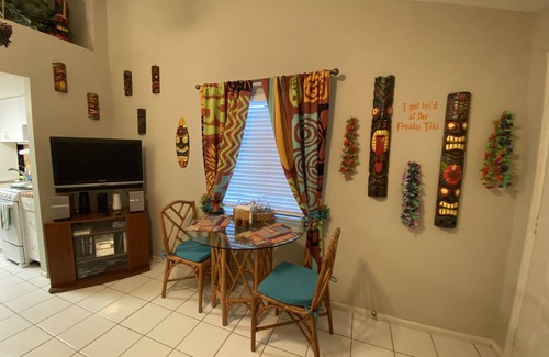 Welcome to "Gettin' Freaky in the Tiki" at Paradise Lakes Clothing Optional Resort in Lutz, Florida. This condo is located in a NUDIST community. Enjoy your morning coffee in the buff from the screened lanai of this 2nd floor lake view condo. Relish in the retro feel of old Florida while experiencing classic comfort with a Tiki twist. It IS Paradise Lakes, after all! Enjoy a memory foam, King size bed, and kitchen featuring a refrigerator, microwave, dishwasher, and range. Enjoy the Tiki night lighting and don't forget to take your picture by the "selfie wall."