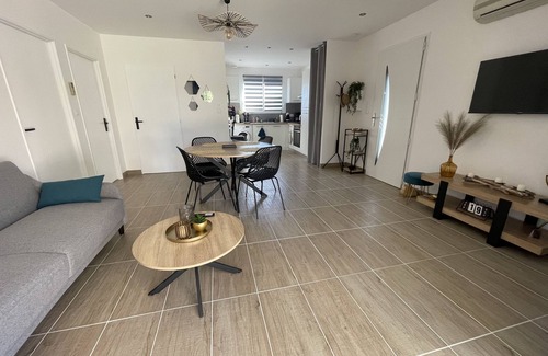 This family house, ideally located just a 3-minute walk from the village center, can comfortably accommodate 4 adults and 1 child thanks to a convertible sofa. The house is fully fenced, allowing you to enjoy independent access for a peaceful stay.
