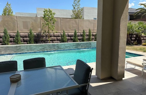 Discover this custom 3-bedroom gem in Mesquite. This beautiful house features 1 king bed, with sitting in primary bedroom . 2 bedrooms with bunk beds, king size on lower and twin size beds on top, perfect for golfers or a groups of friends. It features a chef's kitchen, 3.5 upgraded bathrooms, guests will feel right at home in this oasis escape. Enjoy the AC, cool off in the luxurious pool or relax poolside in the shade. We think our place will help you experience everything Mesquite has to offer.