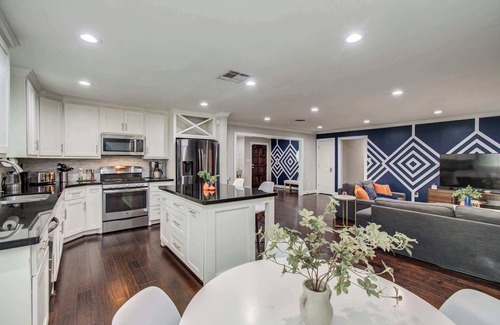 Your whole group will be able to gather in the cozy living room to relax, watch TV, chat, or play games. The beautiful interior design is modern with stunning furniture and décor. The kitchen opens to the living area so everyone can be together. You will love being in this amazing chef's kitchen with stunning granite countertops, custom cabinets, and stainless steel appliances. You’ll find it fully equipped with everything you need to prepare your own fresh meals or enjoy some delicious local takeout. Have your meals on the barstools at the large island, in the cute breakfast area, or in the gorgeous dining room.