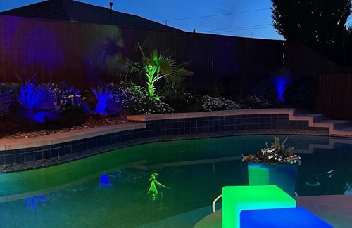 As dusk falls, you’ll love the exterior mood lighting and blooming hillside which perfectly complements the pink California sky. Enjoy sipping a cocktail under the pool umbrella, recharge in the large 7-person hot tub, or make smores by the fire. You could also watch your favorite shows in the outdoor living room, feed the friendly koi fish, play a game of cornhole, or lounge anywhere in between.
