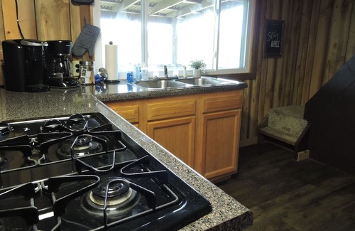 The kitchen comes equipped with a table for 4, refrigerator, a freezer, a gas stove top, a microwave, and a coffee pot & keurig. In the evening, guests can chill out on the sofa in the cozy living area and enjoy multiple channels on the large 50” flat-screen TV that comes with satellite channels above newly added fireplace. Outside, guests can spend some quality time on the covered porch while gazing at the starry night sky.