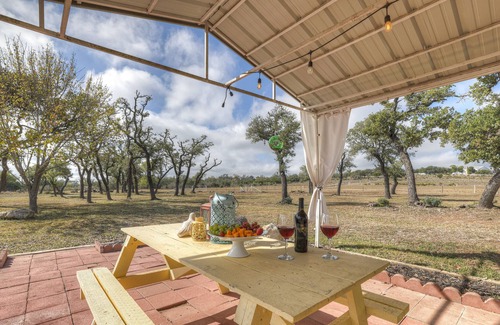 The outdoor space has a covered patio, seating area, and firepit to enjoy the sunrise or beautiful Texas Hill Country Sunsets. Grill up some steaks or burgers on the BBQ pit and gather around the picnic table for great conversation with family or friends.