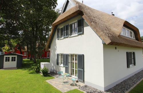 The bright, newly built in 2016, 135 sqm thatched house meets the highest standards of furnishings and equipment. Furnished with great attention to detail, it offers three bedrooms, kitchen, living and dining area, two bathrooms, fireplace, sauna, sunny terrace and private garden enough space for six people, whether for relaxation or as a starting point for various activities in the region ,
