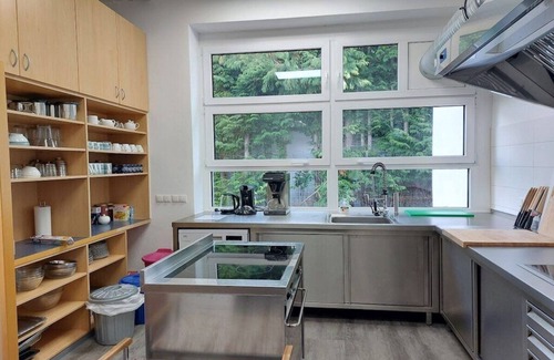Holiday/group house - ideal for cozy family/group gatherings and large celebrations! Large event/breakfast room with a large kitchen and a stunning panoramic terrace. 12 double rooms (up to 24 people) with bathtub/WC. You can book the entire house for your own use for group meetings, large celebrations, etc ensuring maximum privacy and individual arrangements. Our cozy group house/holiday home "Panorama" is quietly situated in a beautiful panoramic location between the golf course and the edge of the forest, not far from the heart of Bad Harzburg. Whether you're looking for group accommodation or a large holiday home, hikers, cyclists, winter sports enthusiasts, bikers, sports clubs, as well as large families and groups will find a cozy holiday home to enjoy together. The spacious panoramic breakfast room (with bar and terrace) also offers a private space for shared meals, large celebrations, social conversations, or watching TV with friends or family. Bright and comfortably furnished double rooms with bathtub/WC, hairdryer, and safe. Our holiday home is equipped with a spacious kitchen for self-catering. Please inquire individually!