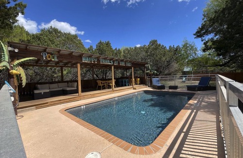 “Happy Trails” is the perfect name for this great Frio River vacation getaway home! The western theme is carried though out the house in every room. The bedrooms are arranged for your multiple family FRIO RIVER trip with a great loft for board games or cards. The large covered carport is the perfect place to create your own dance floor after a fun day in the Frio River. To enjoy your time in the Frio River is easy to do, but to return to your rental home and have a great swimming pool for more fun is the ultimate Frio River vacation! Enjoy the sun and water in your own backyard! “Happy Trails” has great parking, large covered front porch, the covered carport, and seating around the outdoor fire pit. The safety fenced pool has sun decking available for another entertainment area. Your Frio River access is a short distance from the house. Don’t ride off into the sunset without reserving this home for your next trip to the Frio River!