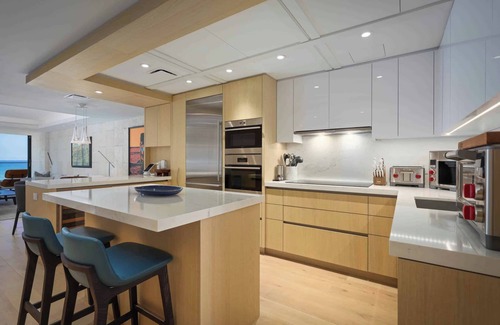 This immaculate, oceanfront, newly-constructed, island masterpiece offers floor-to-ceiling sliding window walls that create indoor/outdoor living space, a sleek, epicurean kitchen with Wolf and Sub-Zero appliances, wine storage and hand-crafted cabinetry, plus a dining table for six. Additional features include two guest suites, each with a 65" smart TV and exquisite, attached bathroom outfitted with a Toto toilet/bidet and marble/quartz countertops (one has a king size bed, the other has a queen size bed), a den/bonus room with a twin over double bunk and a powder room, air conditioning, washer/dryer, and an expansive lanai overlooking the ocean and lush, tropical grounds. This residence is steps from the Hapuna Golf Course Clubhouse.