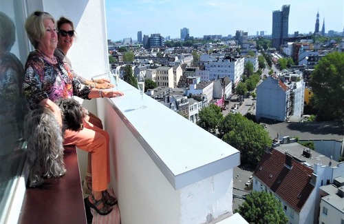 The apartment is located on the 14th of 17 floors directly on the Reeperbahn, opposite the famous Große Freiheit. Both from the loft bed and from the living room you have a wonderful view of the Elbe, Blohm and Voss, harbor facilities, cruise ships, the Michel, the dancing towers, the Spielbudenplatz and of course the entire Reeperbahn. Enjoy your breakfast in the sun on the balcony or in the dining area. You sit on comfortable transparent ghost chairs by Philipp Starck at the extendable glass table by Spinder Design. In the living room there is a high-quality leather couch from Bali Messina, which can be turned into a comfortable bed with a separate mattress in no time. Or you can relax in leather, from comfortable Bauhaus armchairs. Integrated in the living room is a kitchenette, which has a ceramic hob, fridge-freezer, dishwasher, microwave with grill, cutlery, dishes and glasses. In the bedroom is a large mirror cabinet and a loft bed (160x200), from which you can watch the goings-on in the morning. There are swivel flat TVs in the living room and bedroom. The bathroom has u. a. over a bathtub with a glass shower screen. Pets are welcome on request. Bed linen and towels are sufficiently available. Laundry and cleaning service can be booked for a fee. Shared washing machine and dryer are in the basement, underground parking space can be booked.