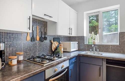 Fully equipped with fridge, oven, microwave, toaster, kettle, and cooking utensils. Washing machine also included.