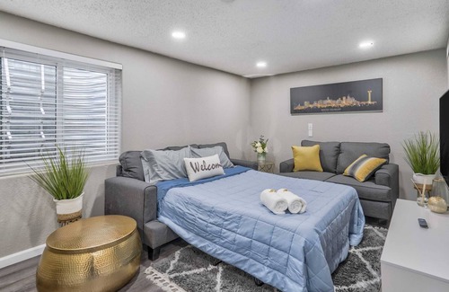 As you walk in, be welcomed by the complimentary snack and drinks! The living room is simply quaint and cozy for your stay! Kick back and enjoy the large Smart TV in the living room so that you can log into your favorite streaming services and pick up on your favorite shows you were right in the middle of before your travels!