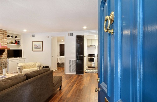 Walk into the main room of this property and you'll be greeted with wood flooring, a brick fireplace and lots of comfortable seating. Right around the corner is the full kitchen with stainless steel appliances and stocked with all the essentials. The king-size bedroom is roomy and well-appointed and you'll find an attached bathroom as well. Just through the bedroom you will find a door leading into the beautiful courtyard that is shared with the main house. This is a perfect spot to get some fresh air or enjoy a morning coffee.