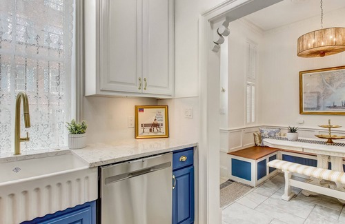 The kitchen is decked out with stainless steel appliances, including a double-door fridge with a water dispenser, gas range and stove, range hood, microwave, toaster oven, and dishwasher. The Douglass House kitchen includes many tasteful accents, such as the gold cabinet pulls, which beautifully complement this Savannah vacation rentals' tasteful blue and white color scheme.