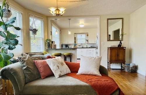 This charming two bedroom gem is perched on a corner lot with abundant windows allowing endless warming natural light to flutter in through the trees fall leaves. The best of old and new with original hardwood in the living areas, retro pink tiled bathroom, brand new carpets in the bedrooms plus a spacious and well equipped kitchen with new appliances. The in home laundry room is great for longer stays and the two car driveway makes parking a breeze. For those traveling with fur family, this is an ideal location. Not only are we dog friendly, but there's a little park right across the street perfect for potty breaks and one of the city's best off leash dog parks at Seattle's famous Golden Gardens Park just two miles away.