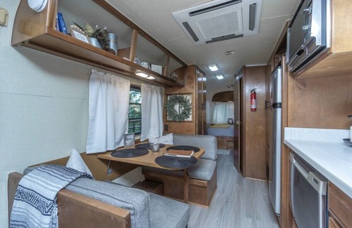 The vintage camper has a cozy queen bed, a sofa bed and the dinette table can be reconfigured to form a child’s twin bed. We have two hammocks available upon request. Inside the camper is a refrigerator, microwave, hot plate, dishwasher and a gas grill with a separate burner for cooking and grilling outside.