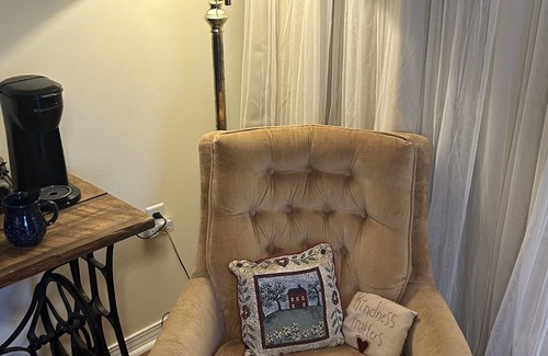The suite is comfy cozy private and charming. I love using vintage sheets, which don’t always match but I adore their soft feel. I also keep a beautiful comfy quilt and lots of pillows on the bed. Toiletries provided.