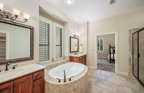 Stay comfortably in Grapevine at this 3-bedroom house. With 1 king bed, 1 murphy bed, and 2 full size beds, our property provides a phenomenal sleeping experience for guests. Charming 3-bedroom house walking distance to beautiful historic Grapevine. custom home located just steps away from Grapevine's historic Main Street (4 MINUTES WALK). 3 bedrooms, 3 bathrooms, and a 3-car garage with workshop. Exquisite woodwork, custom built-ins can be found throughout the home. The kitchen is inclusive of custom cabinetry, ample counter space, breakfast nook as well as a large island perfect for entertaining. The living room with beautiful vaulted ceilings with a see-through glass fireplace that flows seamlessly into the dining room. The Master Suite that has it all including elegant vaulted ceilings, luxurious Master Bath with double vanities, spacious tub and walk-in-shower. The Master Closet includes ample storage and hanging and also a storm cellar. A separate utility room.