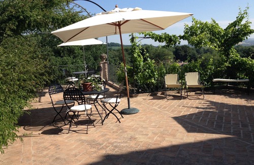 Housed in a 16th century country house, open onto a terrace overlooking the Martani Mountains, the apartment is bright and furnished with care and style. Located on a hill, in front of Todi, which is only 3km away, it has a magnificent swimming pool with a splendid view, and is surrounded by a green and well-kept countryside crossed by the "Landscape itineraries". The apartment is a successful combination of modernity with ancient elements: the large beams harmonize with the elegant gray slab floor; modernity approaches the severe stones of the bastion of the medieval tower, which faces obliquely into the back wall of the living room. A master bedroom with a comfortable king size bed, a modern bathroom with shower and a small but well equipped kitchen with a minimalist design complete the accommodation.