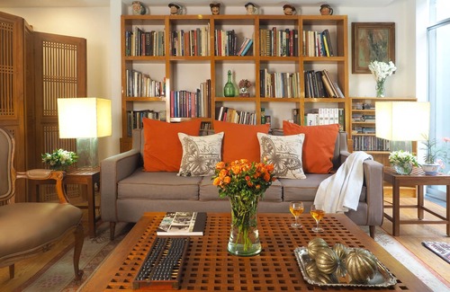 Just by opening the door, the space amazes you with two levels connected by an internal staircase and art gallery vibes. Everything around is unique: an eclectic décor, shelves with plenty of books, antiques, masks, art, and more art... you're in a home full of stories. And, what about the big windows, the beautiful natural light, and a view that will make you feel in a forest!