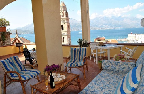 Apartment located in the center of Gaeta with access from the medieval village and a large terrace with panoramic view over the harbor and arches of St. Mary of the Bay of Gaeta and the bell tower of the Cathedral of St. Erasmus dating back to centuries. XII. The apartment consists of living room with sofas and tv, small kitchen and a large double bedroom, all with direct access to the terrace. The latter consists of a large living space, partially covered, fully equipped with tables, chairs, sofa and outdoor sink. There are also two further double bedrooms, one overlooking the alley and the other with light socket from the entrance, and two separate bathrooms with shower. The apartment is suitable for a family of up to six people or for two couples.