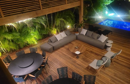 Modern house, finely decorated and furnished, with 6 air conditioned suites (sleeps 18) and more dependence (with 3 beds), covered parking, swimming pool, dining rooms (with gourmet) and TV, two toilets, gourmet area with barbecue, close to the sea, in condominium Natural Pools (with 24hs security, club, courts, swimming pools and gym of common use).