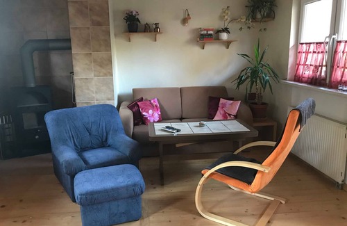 Cosy beautifully furnished holiday house with private terrace and view of the nature, free parking at the house, barbecue and fire bowl for free use, small playground, cozy fireplace.