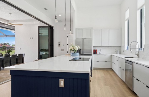 Our high end ultra modern gulf coast villa is situated on the sunny Cape Haze peninsula in south west Florida. It is a peaceful 4 bedroom retreat with one of the largest private pools in the area, there is a vast south facing lanai /patio overlooking an inland waterway with expansive water views where you can relax in the beautiful Florida sunshine while watching the wonderful local wildlife, there are five bikes, a 75” TV, all within a seamless indoor-outdoor living area.