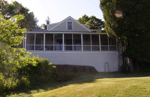 Waterfront views, a private sand beach, screened-in porch, and native charm make an idyllic get-away on exclusive Kennebec Point in Georgetown Maine. The cottage sits on a crest with views to the ocean and to a large tidal bay beyond the lawn and beach.