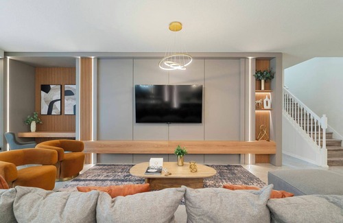 The upstairs bedrooms are arranged around a central loft, featuring a big screen.