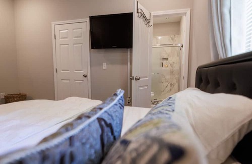 This is a bedroom with a private bathroom in a residential house. House can be share with me and others guests. It is one level floor house from the 1900s, totally renovated on 2022. Access to bedrooms by the hallway. Guest will have a cozy king-bedroom with the Allswell Luxe 12" Bed in a Box Hybrid Mattress with The Allswell Luxe 12" Bed in a Box Hybrid Mattress, a night stand and hand touch on & off table lamp. Wall mountain smart tv and hamper. Full Shower bath with free toiletries.