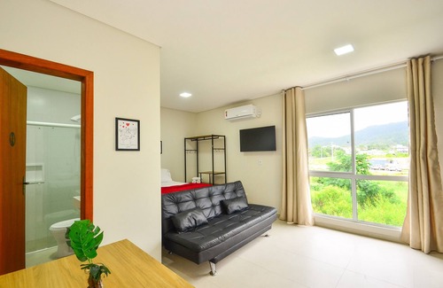 Um espaço especial para férias ou trabalho em edifício novo, com todo o conforto, bela vista para área verde em local super seguro e tranquilo no Campeche, um dos melhores bairros praianos de Florianópolis. Acorde com o canto das aves!