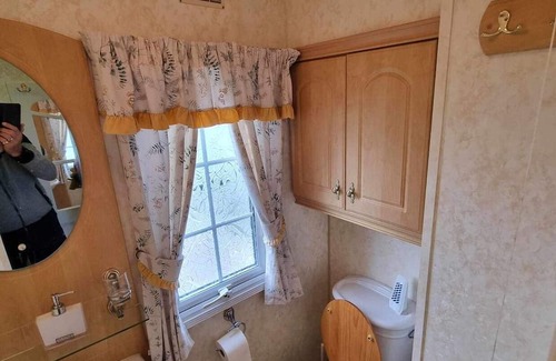 The kitchen has a full size fridge freezer, a full size range cooker with hot plate, a kettle, microwave and an air fryer. The caravan is a perfect place to relax and offers a freeview television with over 100 channels plus a dvd player with a selection of dvds for your viewing pleasure. There is a music system which has surround sound in every room in the caravan. Chose a particular room or have it playing throughout every room. There is a ceiling fan in the room plus central heating throughout. There is a stunning feature electric for suite in the lounge. This caravan has 2 bedrooms and can comfortably sleep 6.In the first bedroom, you will find a king size bed with fitted robes and dressing table, plus an en-suite toilet room with sink. There is also a travel cot provided (your own bedding required for this) The second bedroom contains 2 single beds with fitted robes and dressing table with mirror. There is a bathroom with a sit down shower toilet and sink with mirrored cabinet. Bed Linen is all included and beds ready made up to make your stay more enjoyable. Towels are not included.House Rules: