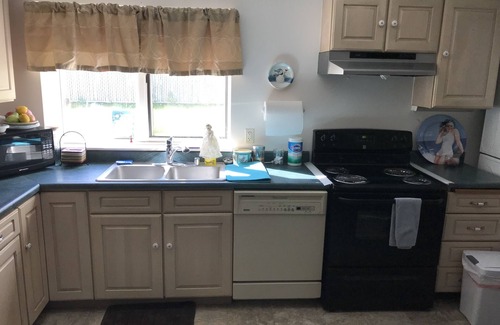 This apt. Is a split level home with 4 steps down.nice and cool in the summer.it is all brand new.the marble walk in shower is not yet done but will be soon for the wonderful land of the midnight sun!it has everything you need for cooking sometimes even fresh halibut when I go fishing!shopping at Costco means there is always lots of food! I love dogs and kids.the property is enclosed by a fence.